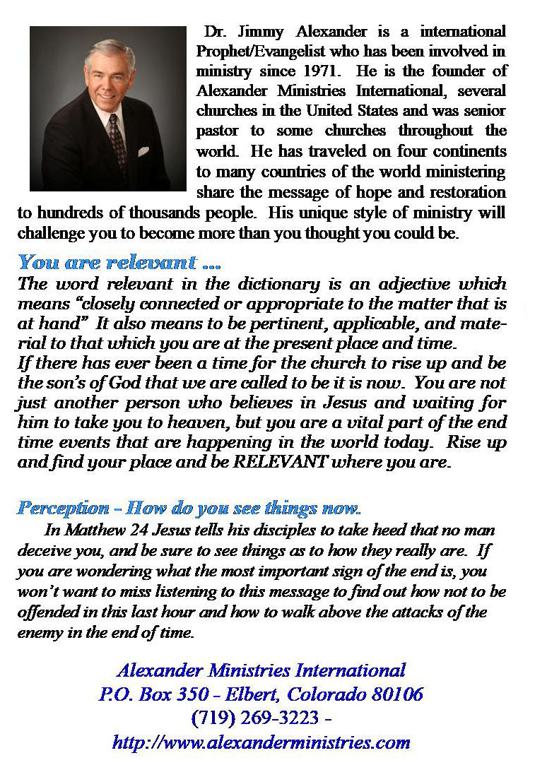 Take heed that no man deceive you, Jesus told his disciples in Matthew 24. We need to be sure we are seeing things as they really are. What is the most important sign of the end of time? Are you finding yourself 'offended' more and more? Would you like to walk above the attacks of the enemy? 1 DVD